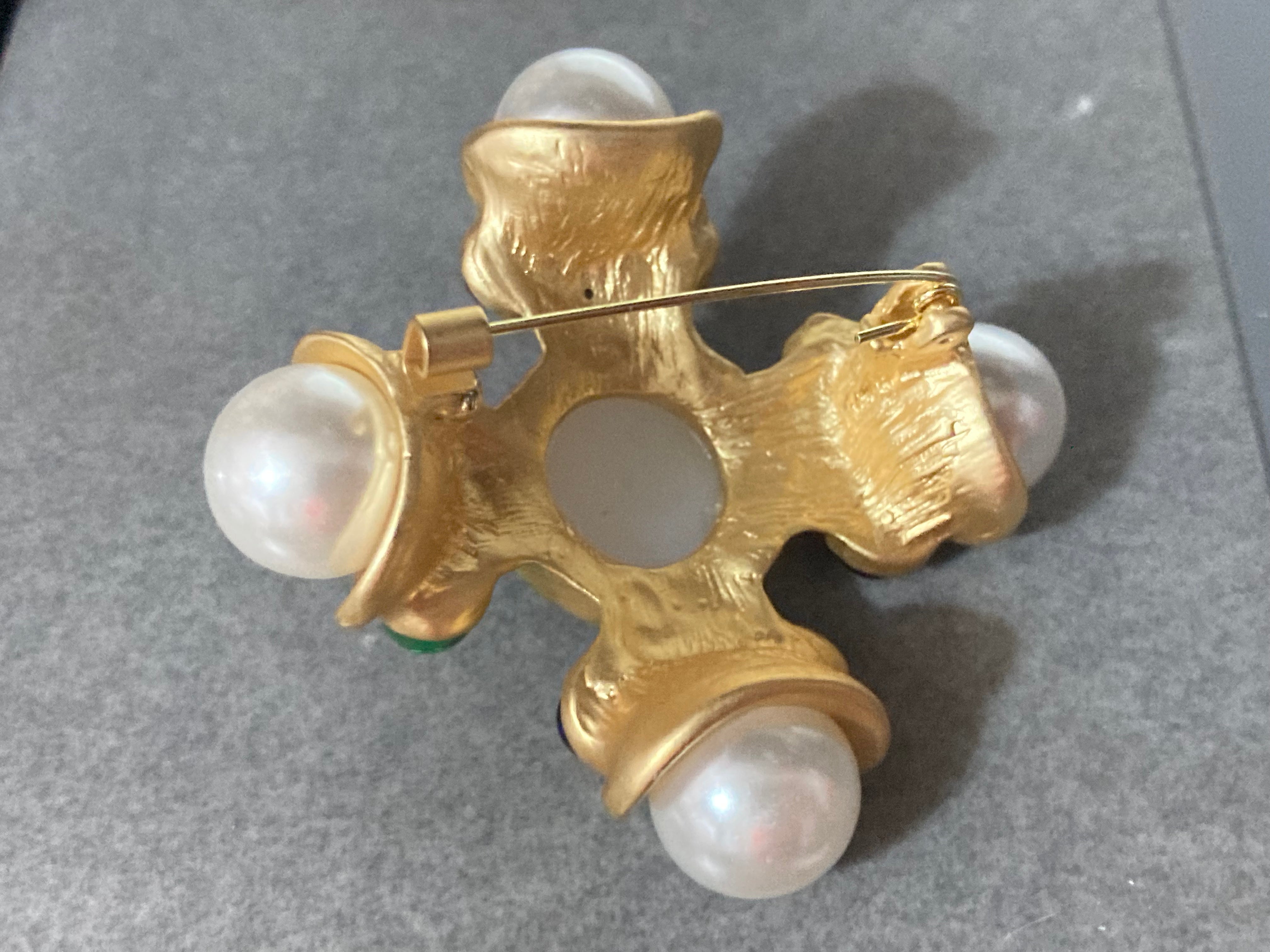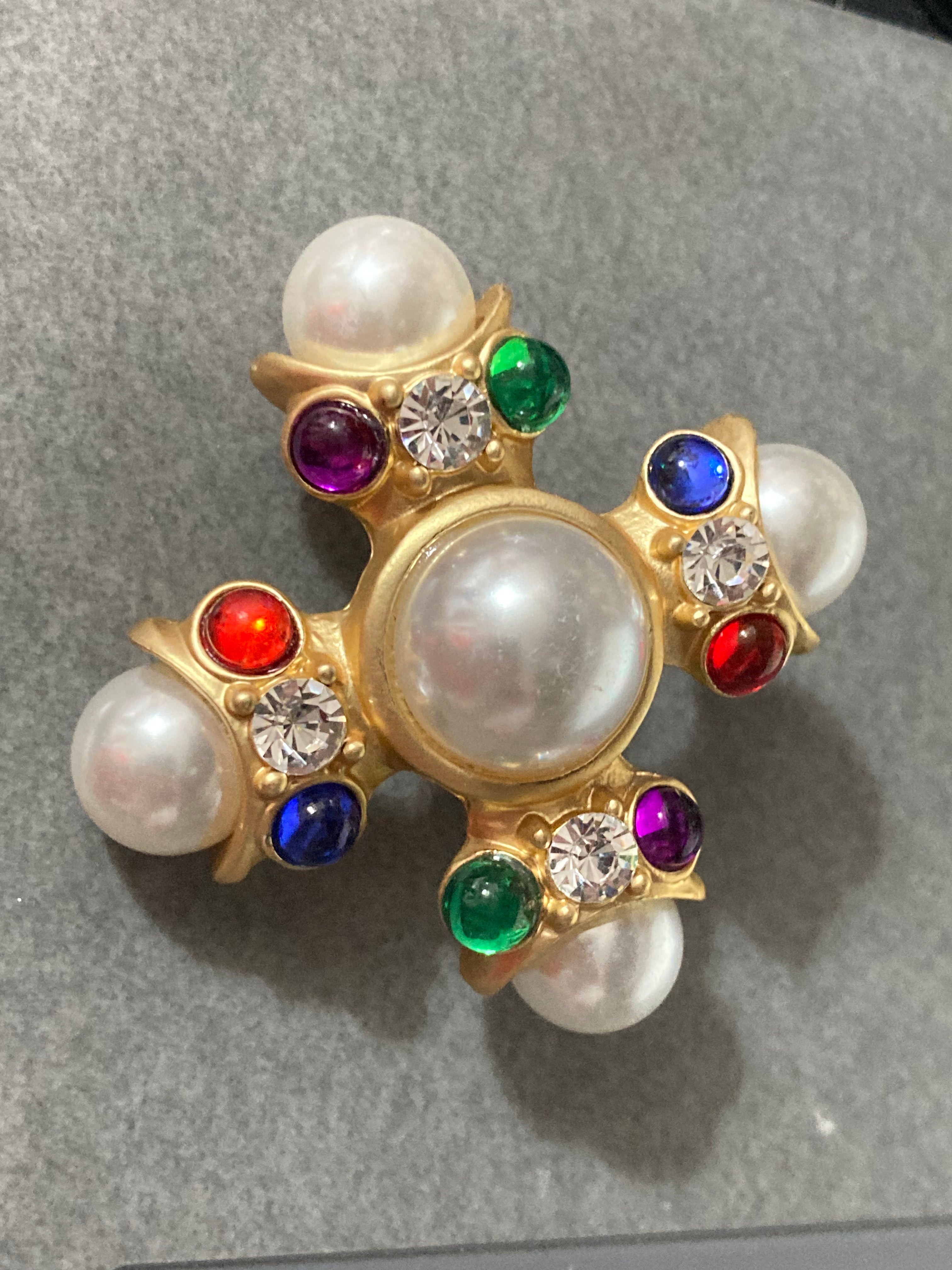 Large gold tone diamanté faux pearl Maltese cross combination pendant and brooch with rainbow gripoix style cabochons