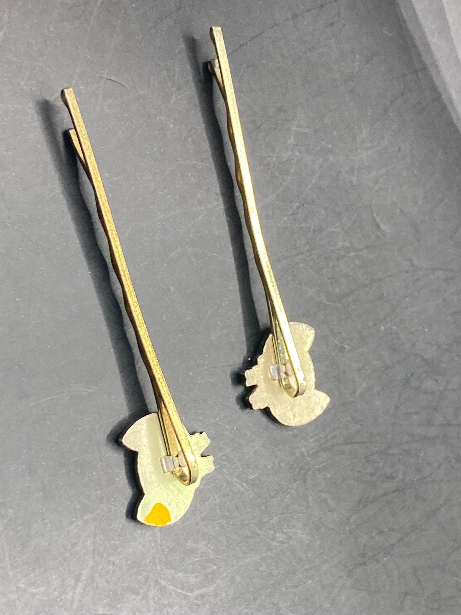 retro Cute Pair yellow enamel cat girls hair grips slides Set 2 Vintage kitsch old shop stock
