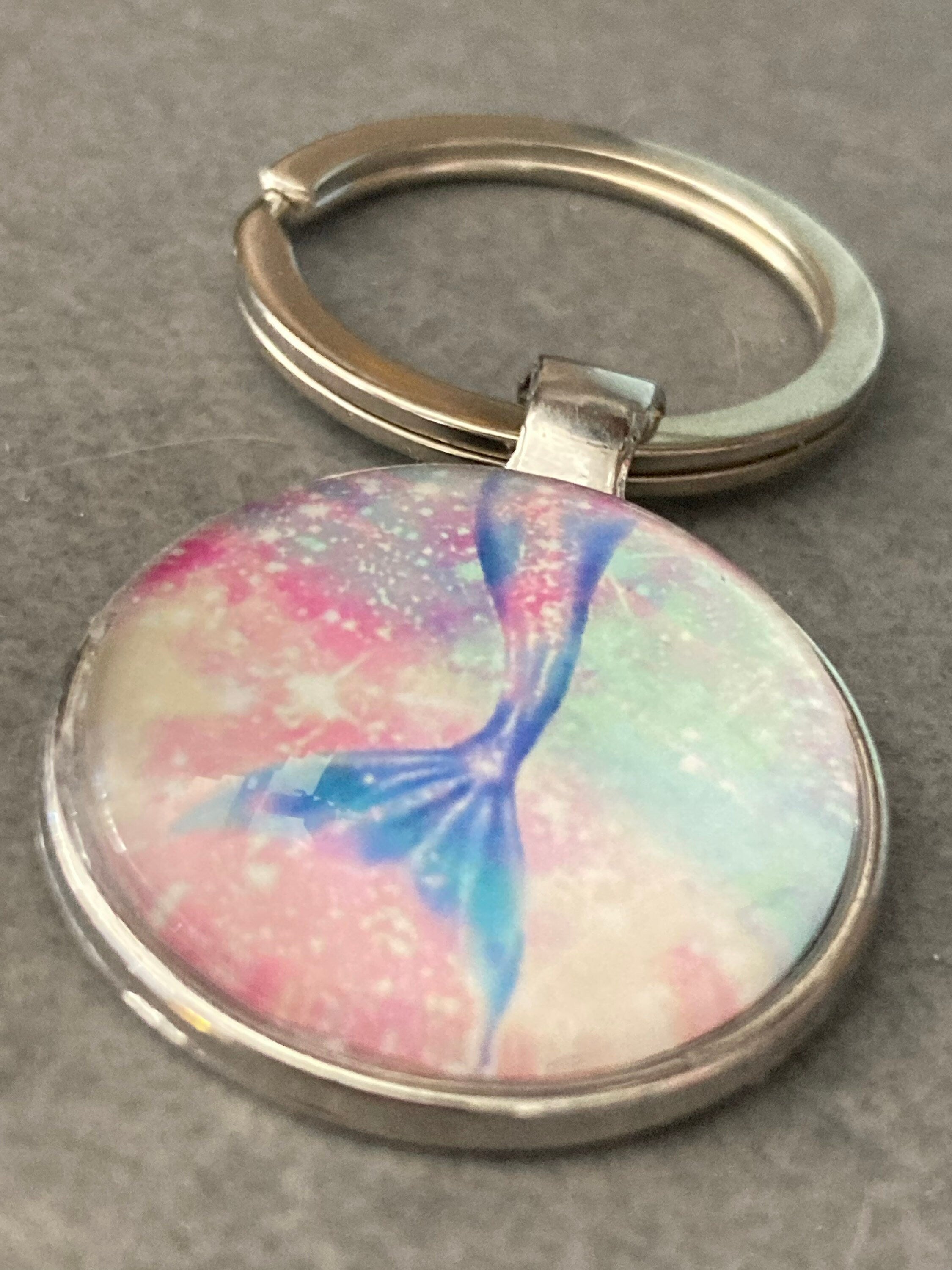nautical mermaid tail silver keyring pink purple glass cabochon