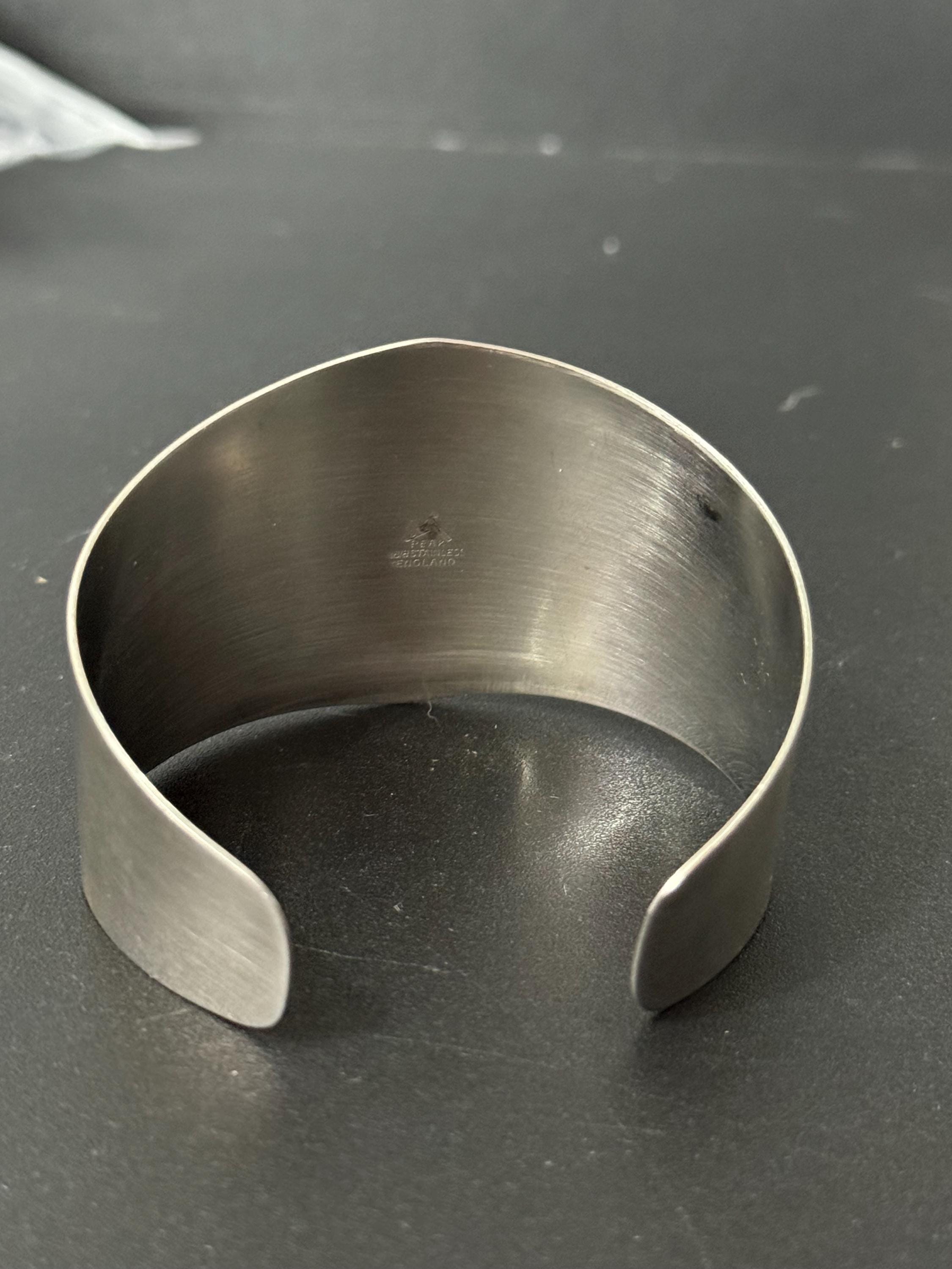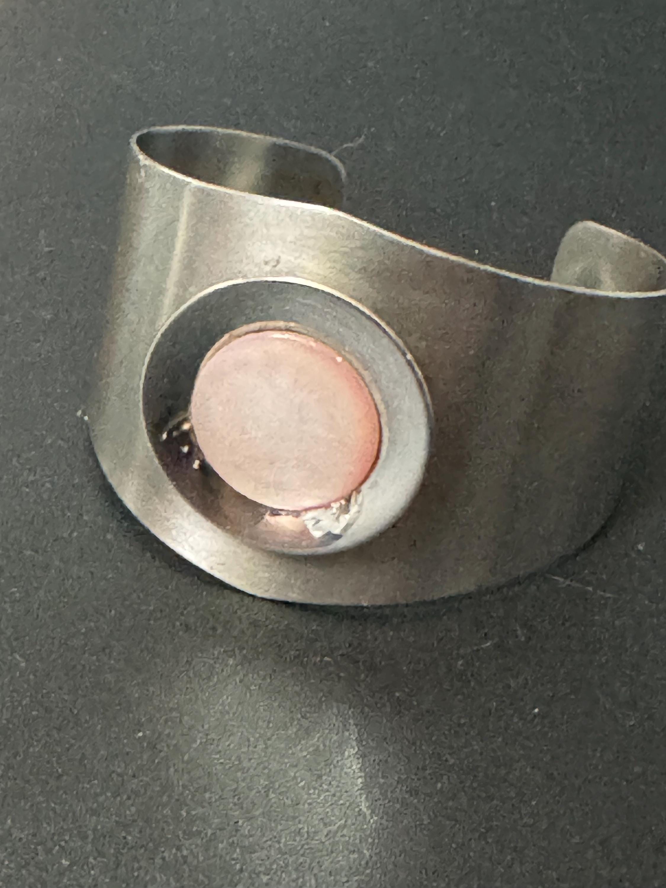 Brutalist silver tone metal pink glass pearl stainless steel bangle bracelet vintage retro 1970s modernist period cuff