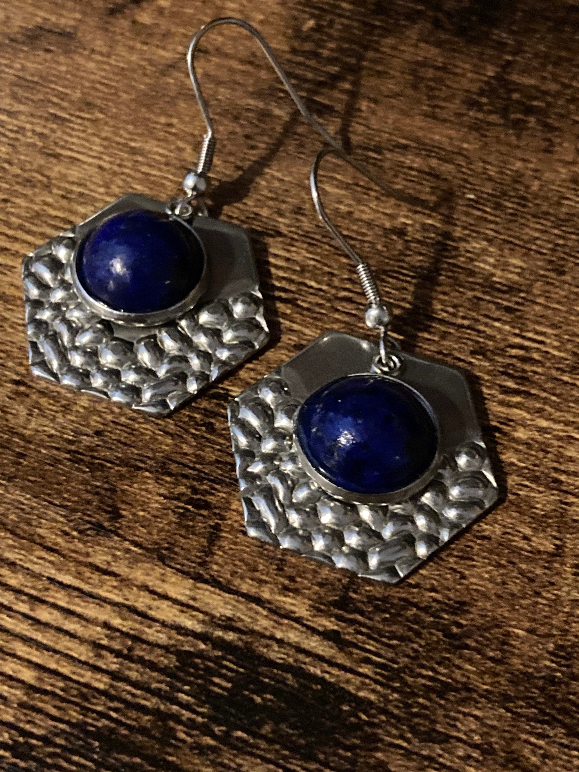 Handmade textured planished stainless steel modernist silver tone hexagon drop earrings with natural blue lapis lazuli gemstone cabochon